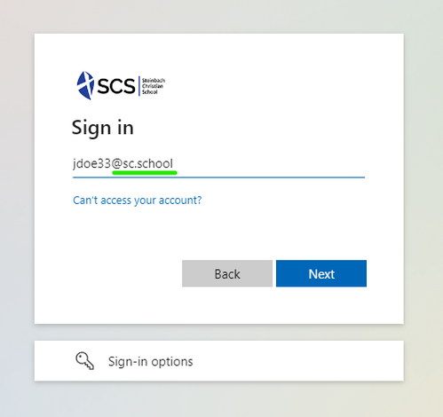 If you are not currently authenticated with your SCS Microsoft Account, you will be prompted to sign in. Enter your username in the format [username]@sc.school